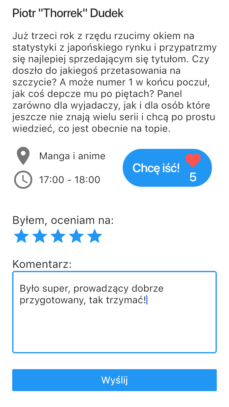 Podbała Ci się prelekcja? Mistrz gry zrobił świetny klimat? Wyraź to! Wyślij swoją opinię do organizatorów.